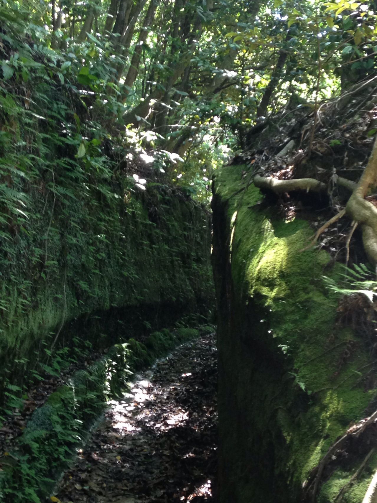 桑舘あずみ ベスパ くまメロ 鋸山の 車力道 鋸山は 山全体が火山性堆積物で出来ていて 房州石と呼ばれる岩石を切り出していた山です そして車力道は この切り出した石を運んでいた道 鋸山 車力道 登山 切り通し